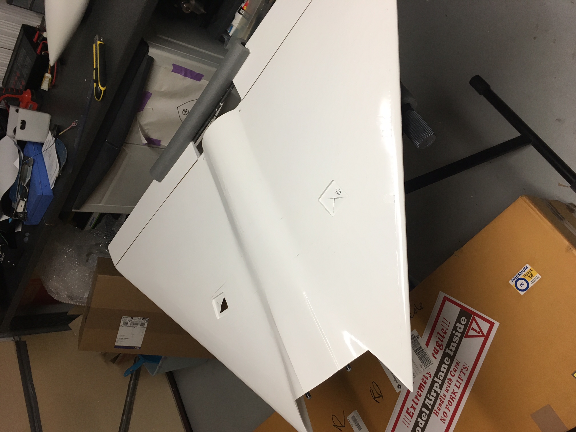 Pour rappel, l'avion fait 1120mm d'envergure et 1500mm de long. C'est un kit fibre-sandwich avec l'aile en une seule partie.