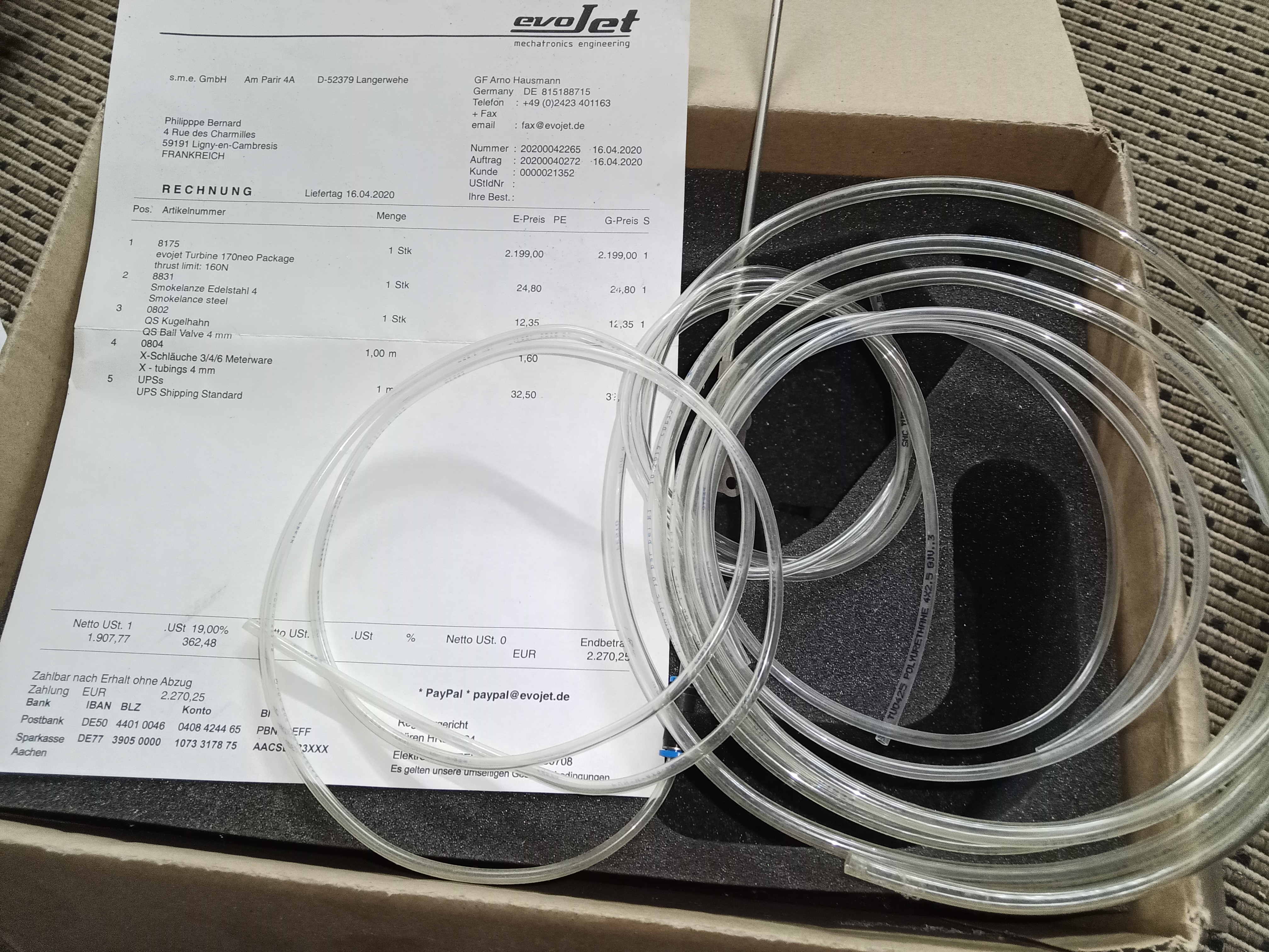 . J'ai également la facture, elle date de 04/2020. Mais (cause construction) la turbine n'a volé qu'à partir de 2022. Valeur de l'ensemble 2270,25€. Vendue 1700€ port Mondial Relay compris. (Le jet est également à vendre, dans une autre rubrique.)